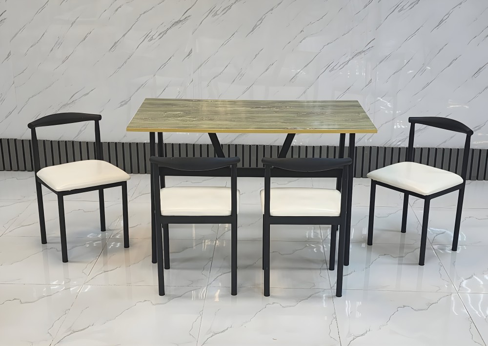 احصلn على طاولة طعام فاخرة مصنوعة من nالحديد والخشب مع 4 كراسي أنيقة، بأبعاد nمثالية تبلغ 120 سم في 70 سم. هذه nالطاولة والكراسي تمنحك مساحة رائعة nلتناول وجبات لذيذة ولقضاء أوقات ممتعةn مع عائلتك وأصدقائك. تصميم عصري وجودة عالية يجمع بين المتانة والجمال. اجعل من منزلك مكانًا مثاليًا لتناول الطعام والاجتماع مع هذه الطاولة والكراسي الرائعة